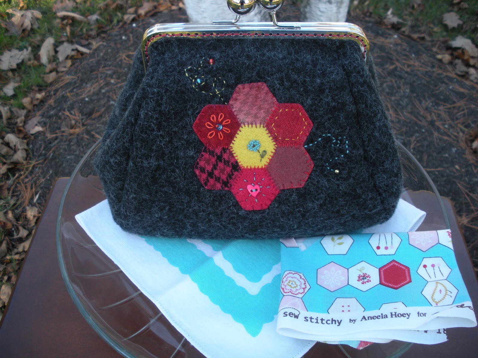 And lastly, because, well...because I Love Wool...I enlarged Madame Samm's pattern and made a purse out of my favorite blanket wool and used some wool scraps in reds and aqua blues to mimic the lining fabric, which is Sew Stitchy by Moda. I do like hexagons and did a little embroidery of my own to match some of the fabric design.